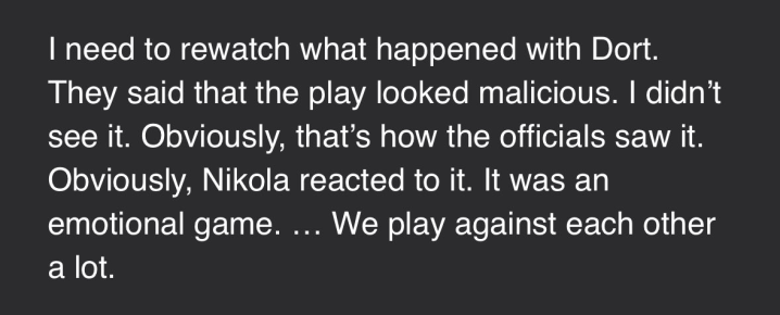 “我需要回看一下多尔特那次具体发生了什么。他们说那个动作看起来是恶意的。我没有那样看出来。当然,裁判显然是那样看的。显然,约基奇对此做出了反应。那是一场情绪很激烈的比赛……我们彼此之间交手很多。”