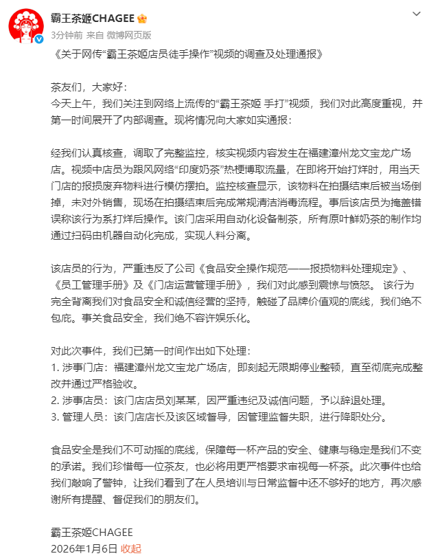 1月6日博星配资,@霸王茶姬CHAGEE 发布《关于网传“霸王茶姬店员徒手操作”视频的调查及处理通报》。