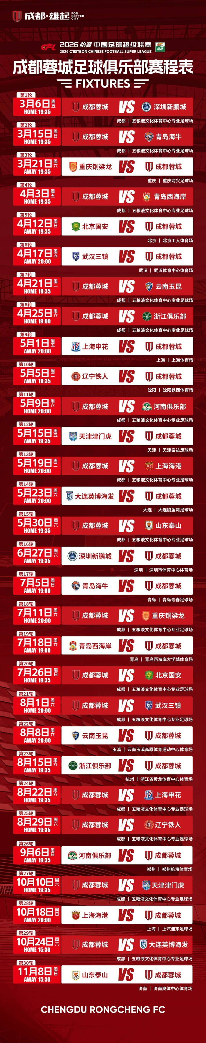 2026赛季中超联赛大幕将启,中足联官方2月14日公布了完整赛程,新赛季中超将于3月6日开赛,11月8日结束。揭幕战放在成都,3月6日,成都蓉城将在主场迎战深圳新鹏城,开启新赛季的征程。在多支竞争球队负分起步的情况下,球队将再次向最高荣誉发起冲击。