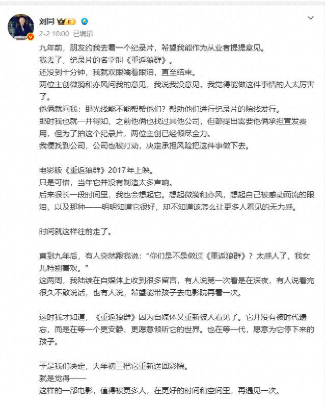 2月2日,光线影业的副总刘同,在微博上宣布,《重返·狼群》空降大年初三。