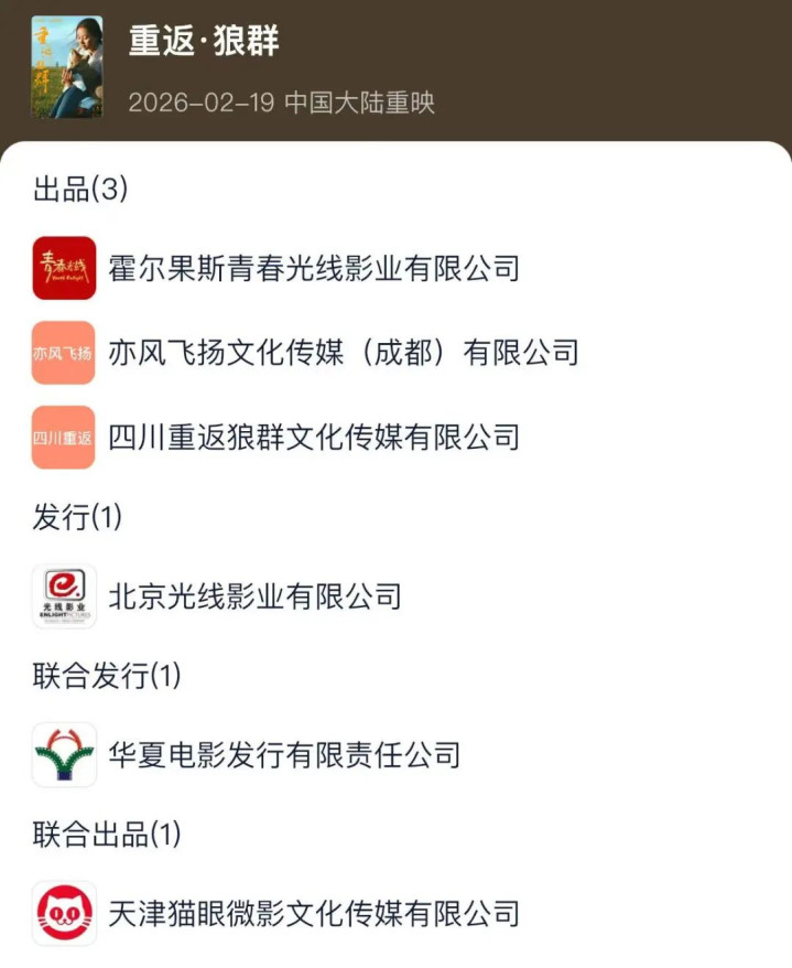 2017年6月,《重返·狼群》纪录片在院线上映,出品方中,除了亦风与李微漪自己,猫眼与光线影业也赫然在列。